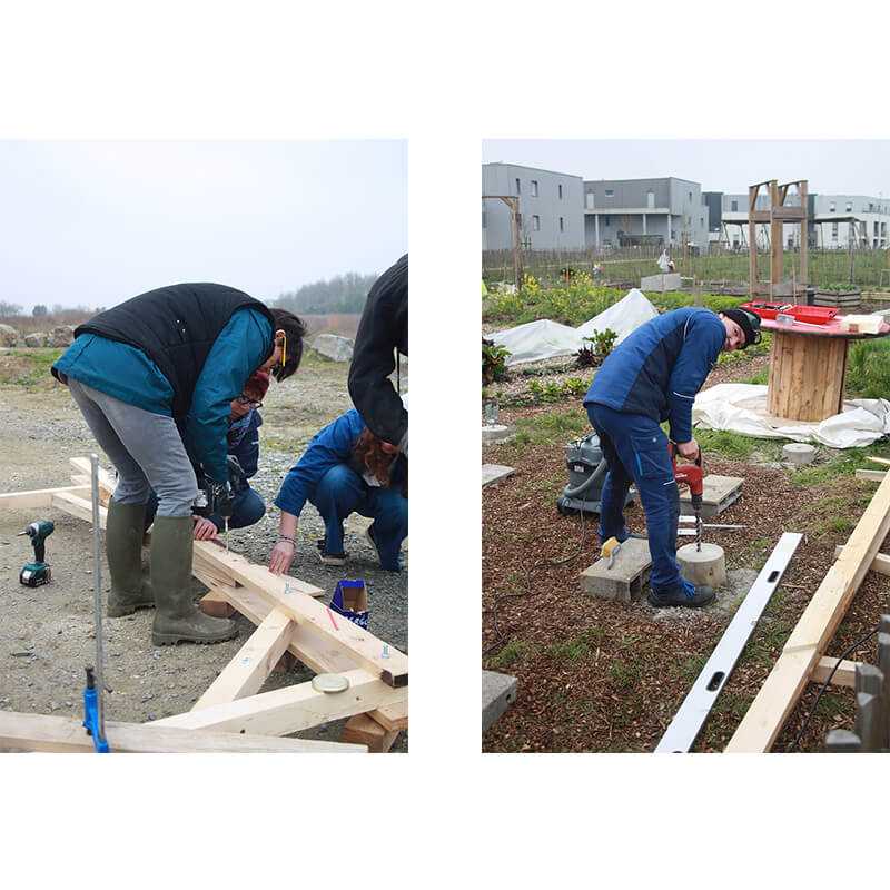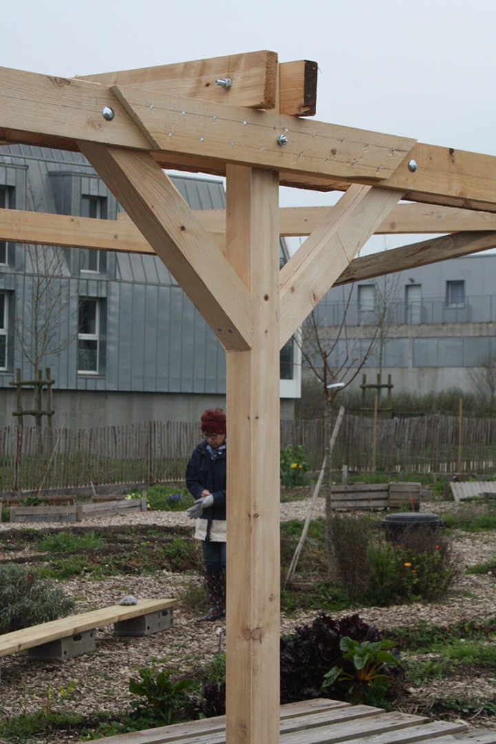 Animation d’un chantier participatif pour réaliser une pergolas avec les habitants d’un jardin partagé. Assemblage mi-bois cloué et boulonné. Plots bétons et traitement de surface réalisés par le collectif.